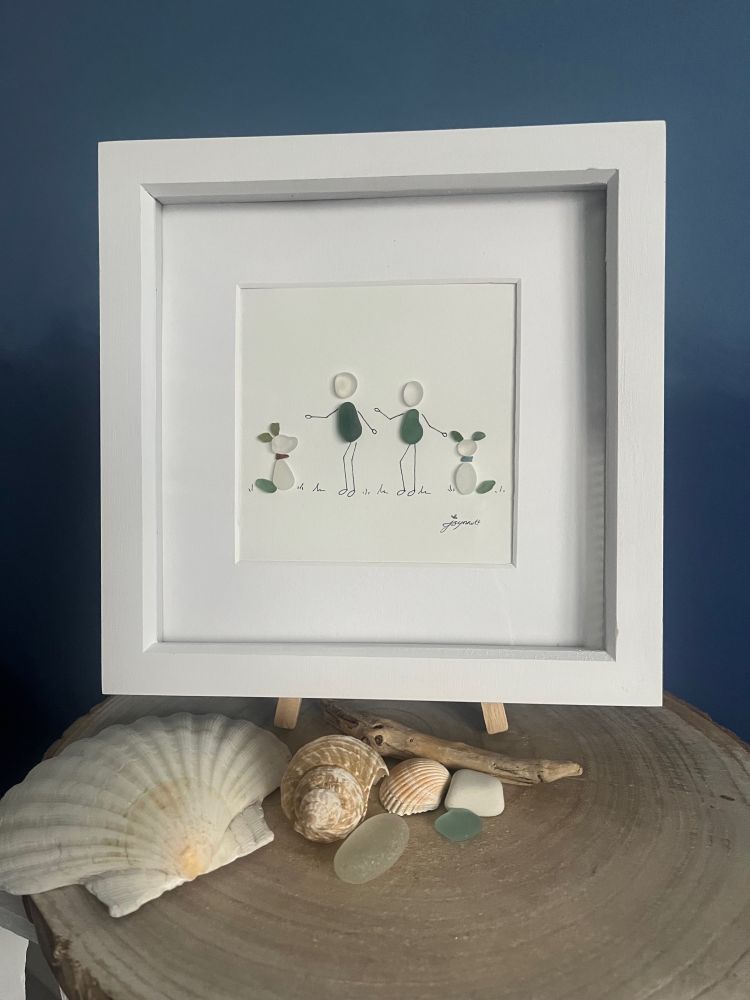 Taking the dogs for a walk. Made from geniune tumbled seaglass from Seaham beach. Wooden frame 9 inches X 9 Inches.