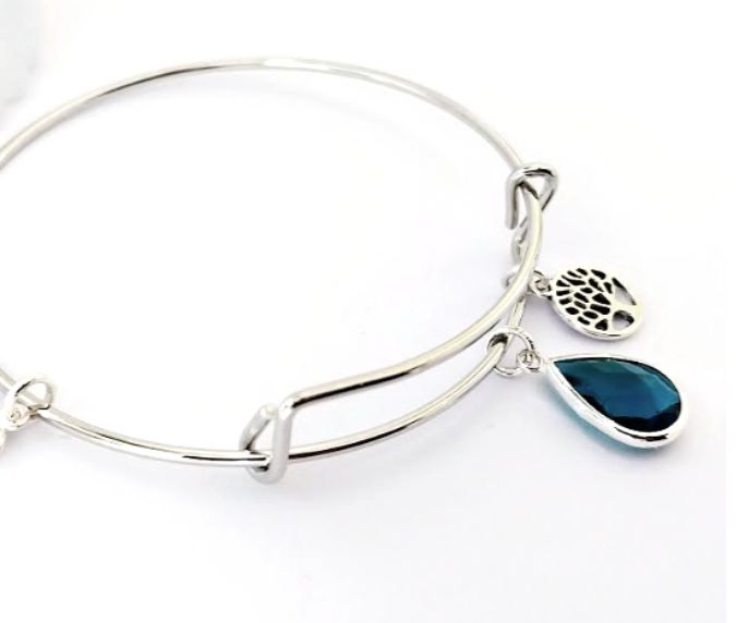 A gorgeous polished stainless steel adjustable bracelet, with an antique silver tree of life charm, a silver framed, faceted glass bead in deep teal and a tiny silver plated heart charm. Lightweight and comfortable to wear…. Elevate your style with this beautiful piece. It arrives in a pretty organza bag, and has free shipping!