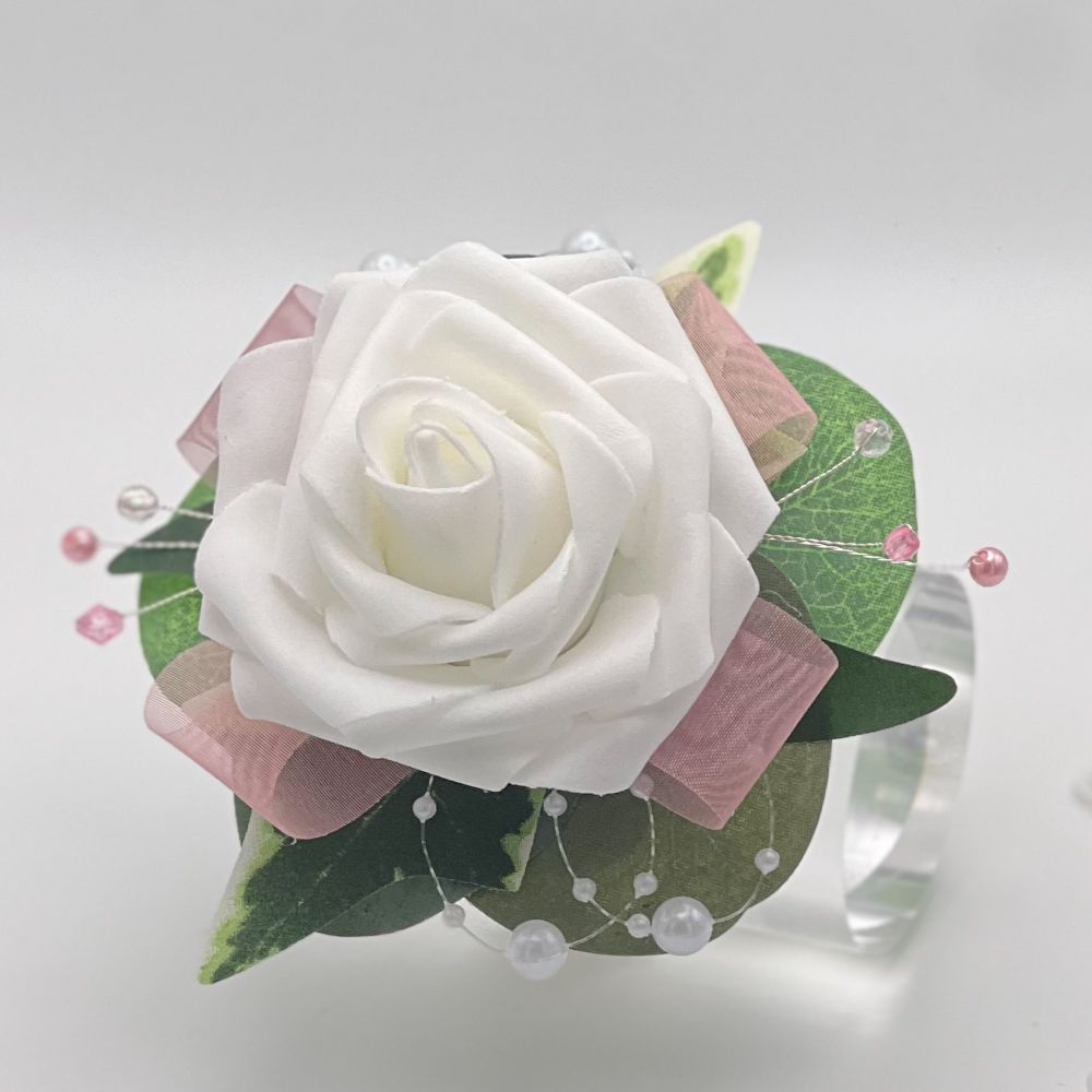 A pretty keepsake debs flower corsage made with an artificial white rose and attached to a white pearl bracelet.